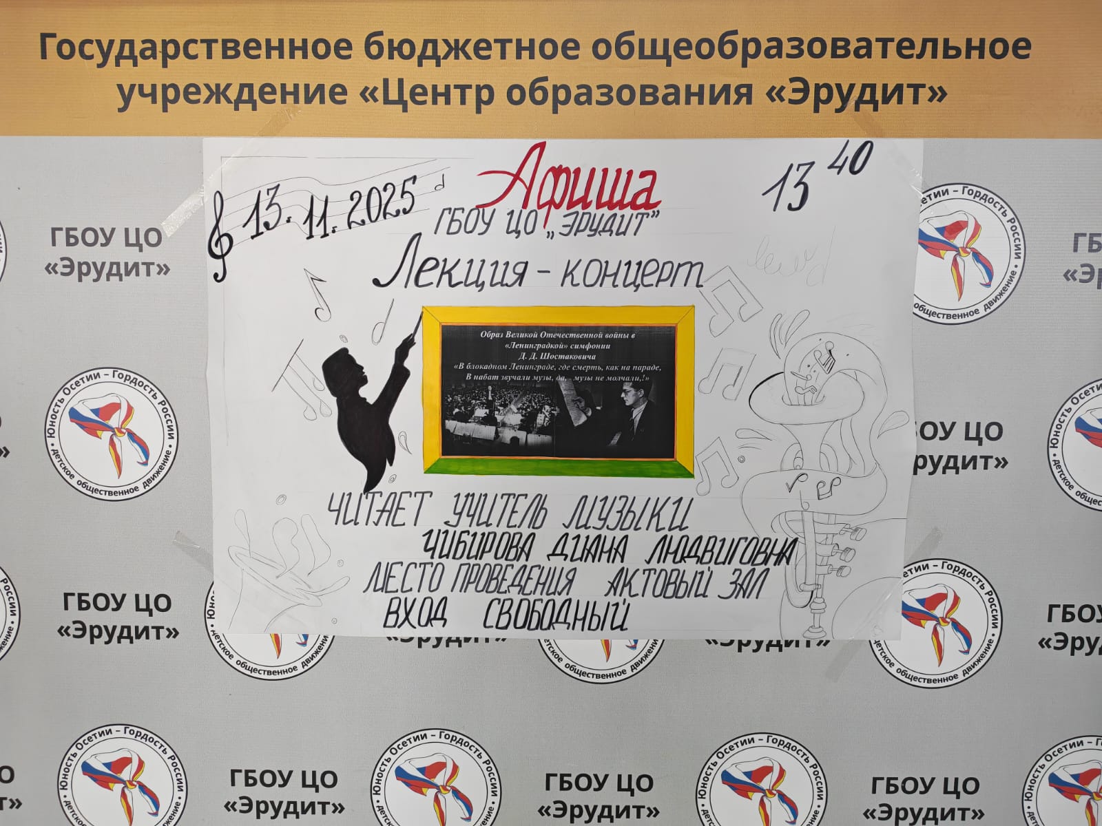 13ноября 2025 года учитель музыки, педагог – методист Чибирова Диана Людвиговна провела лекцию на тему « А музы не молчали….» Д.Д. Шостакович Симфония №7 «Ленинградская», которая была приурочена к 50 –летию со дня смерти Дмитрия Шостаковича и 80-летию Победы в Великой Отечественной войне.
