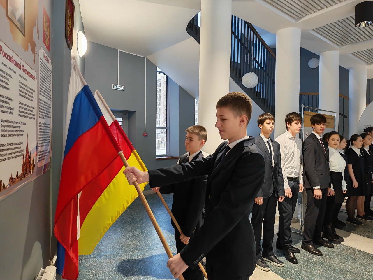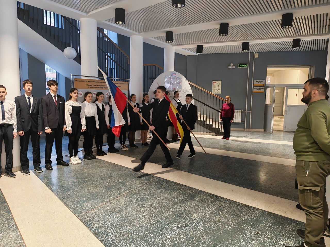 Учащиеся 8 «Б» класса дали старт новой рабочей неделе, исполнив государственные гимны России и Северной Осетии-Алании и подняв флаги. Особым гостем на торжественной церемонии стал участник Специальной Военной Операции.