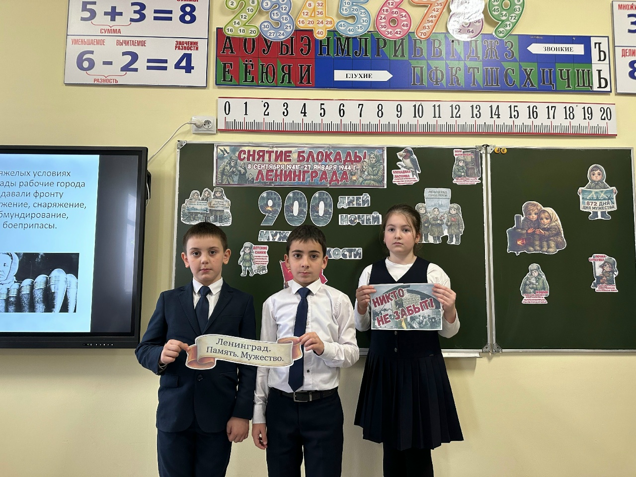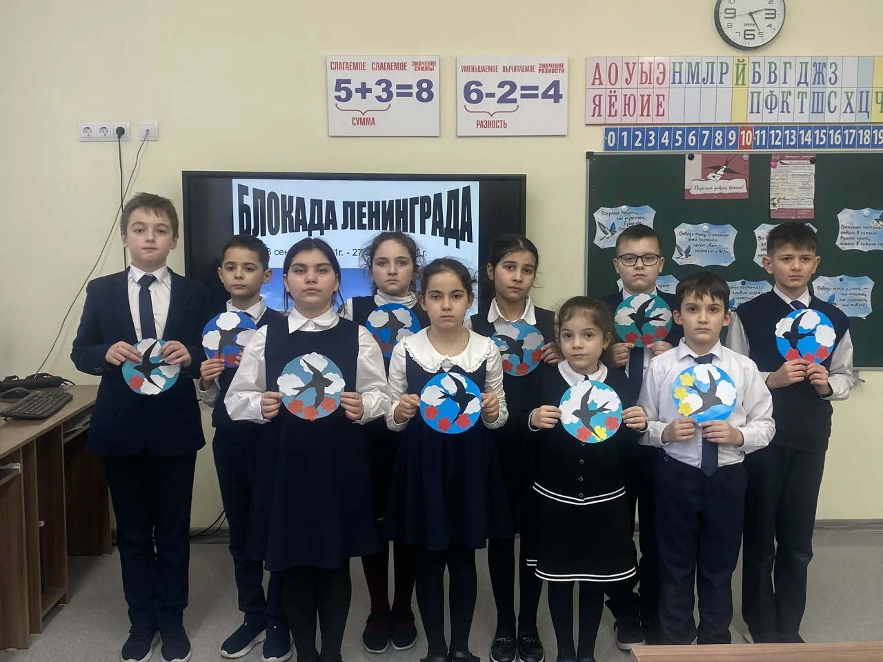 В 1«В», 3«Б»,3 «Г», 3«Е»,4«Е» классах прошли классные часы, посвященные блокаде Ленинграда. Ученики слушали рассказы о стойкости ленинградцев и почтили память погибших минутой молчания. Затем дети изготовили блокадных ласточек – символ надежды и мира, ставших олицетворением непоколебимого духа ленинградцев,что стало актом сопричастности к истории, выражением благодарности и уважения поколению победителей, напоминанием о героизме и ценности мира.