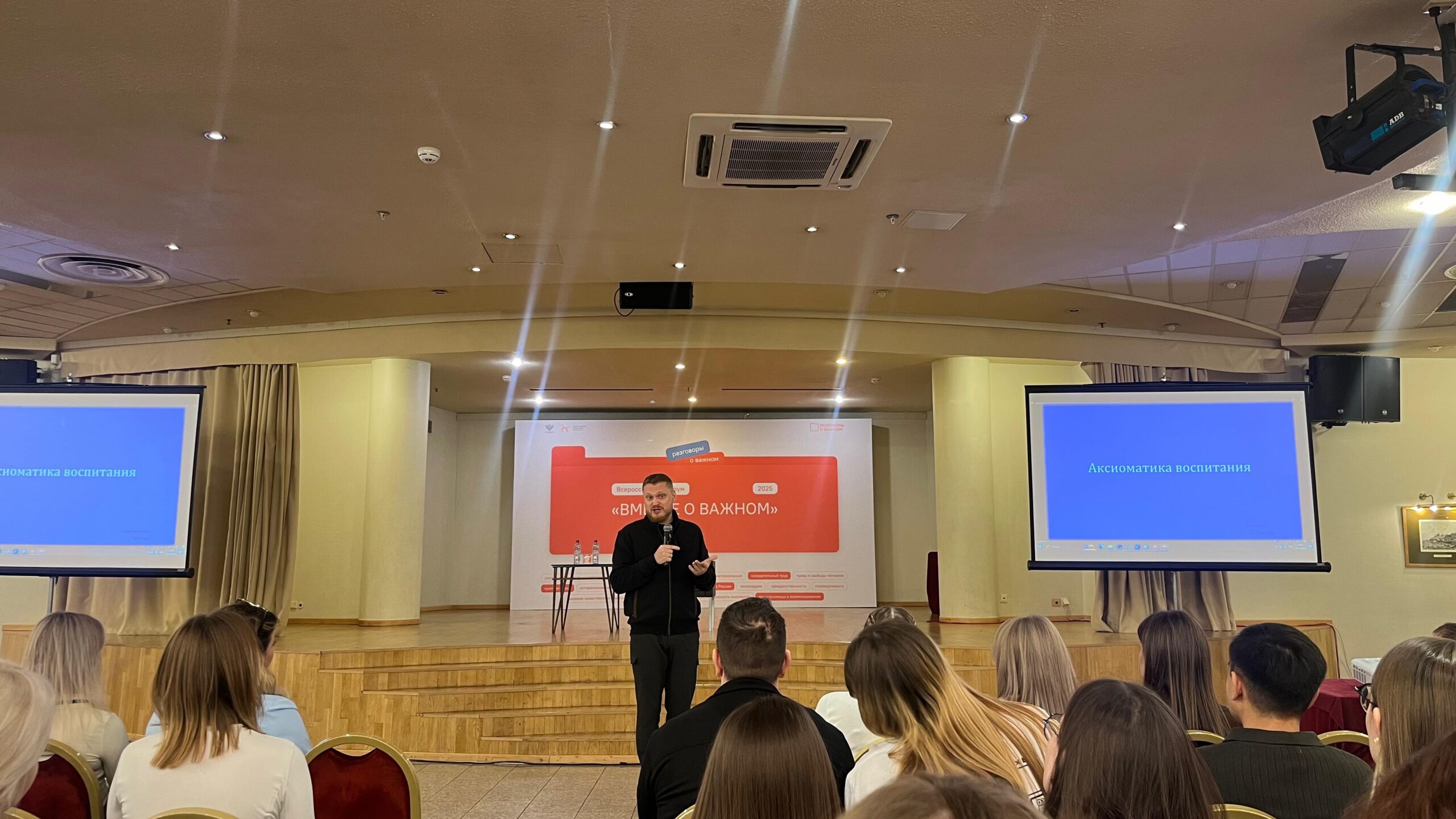 День начался с выступления Евгения Нилова, архитектора образовательных трансформаций и методолога. В своей лекции «Воспитание в работе педагога» он предложил взглянуть на воспитание не как на набор мероприятий, а как на продуманное проектирование образовательной среды, где педагог выступает в роли архитектора и инженера педагогических процессов.