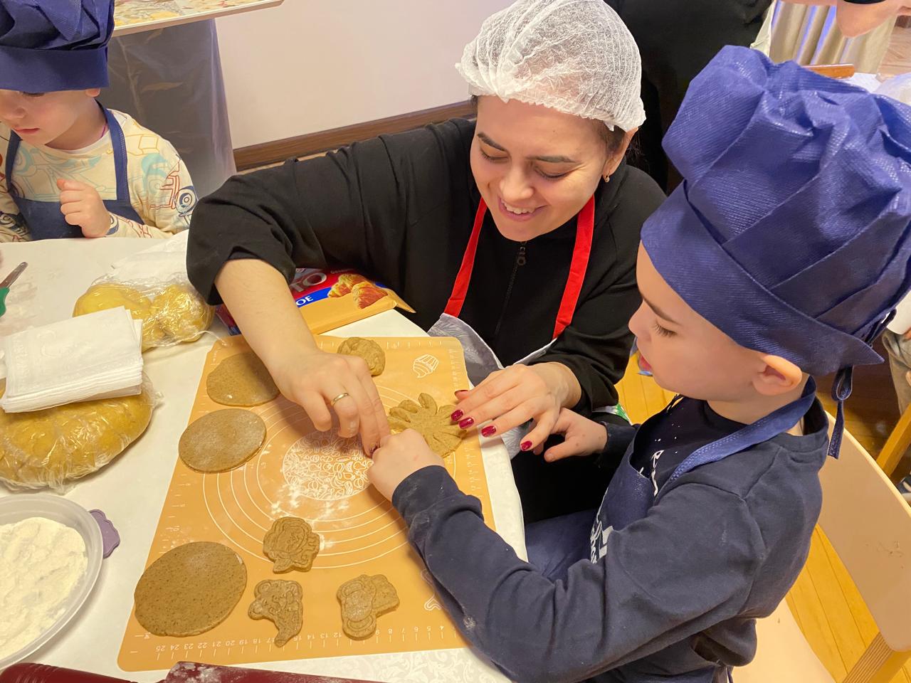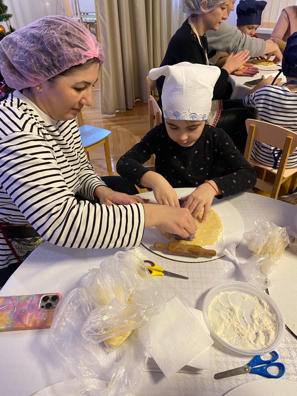 Воспитатель по обучению детей осетинскому языку Джикаева И.Х. познакомила с обычаями и обрядами предков, с символическим значением басылта. Рассказала детям и их родителям о том, какие существуют ингредиенты по приготовлению теста. Родители и воспитанники с удовольствием включились в работу. Дети помогли вырезать фигурки с помощью формочек.